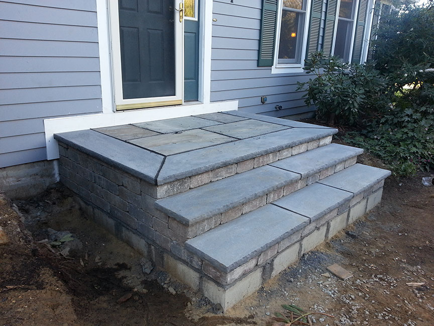 After the backfilling the substructure is complete, the landing construction work can begin. The materials chosen for this job include Brussels Dimensional Stone by Unilock. The antiqued or weathered appearance of Brussels Dimensional Stone is a great alternative to expensive natural stone products. These blocks will form the outside of the landing and stair risers to give it a finished appearance. While we construct the framework using the Brussels Stone, we backfill the inside with crushed stone and mortar. Once the overall height and stair landing layout is complete, the inside is filled with crushed stone to within 4 to 6 inches of the top layer of Brussels Stone. The remaining area is poured concrete with rebar pins locking the three sides together along with concrete wire mesh.