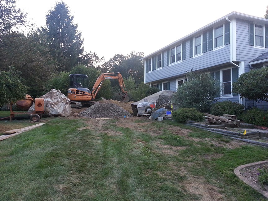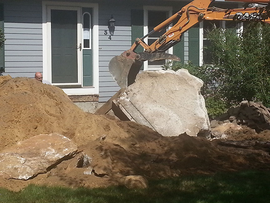 Before we could begin the walkway landing construction, we had to remove the existing landing. Normally excavation would take care of the job. Due to the ledge that the home was built on, the concrete of the old landing was fused to the ledge. This formed a huge rock and required hydraulic equipment to break it up.